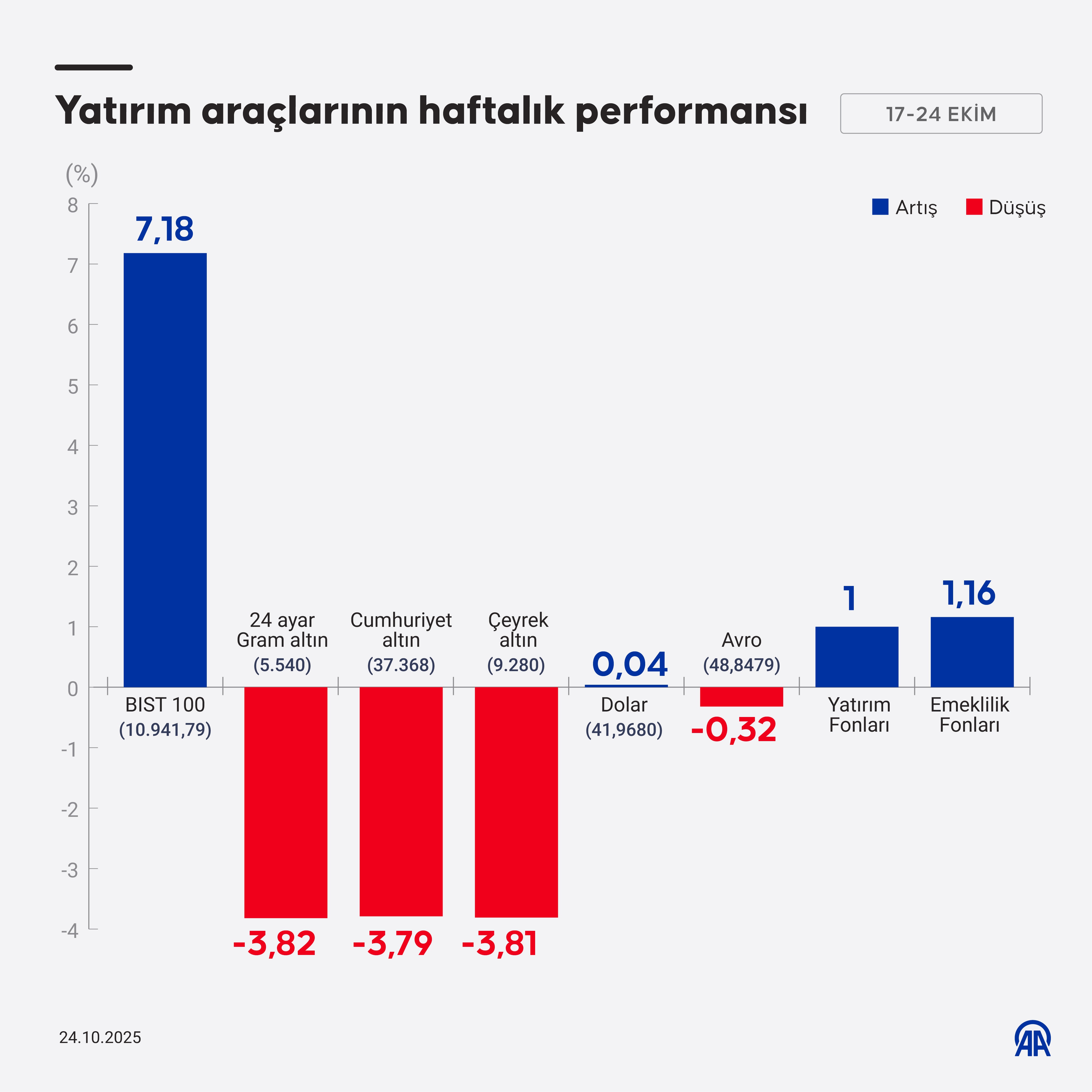 Dolar kuru bu hafta yüzde 0,04 artarak 41,9680 liraya yükselirken, euro ise yüzde 0,32 düşüşle 48,8479 liraya geriledi. Yatırım fonları yüzde 1, emeklilik fonları ise yüzde 1,16 değer kazandı.