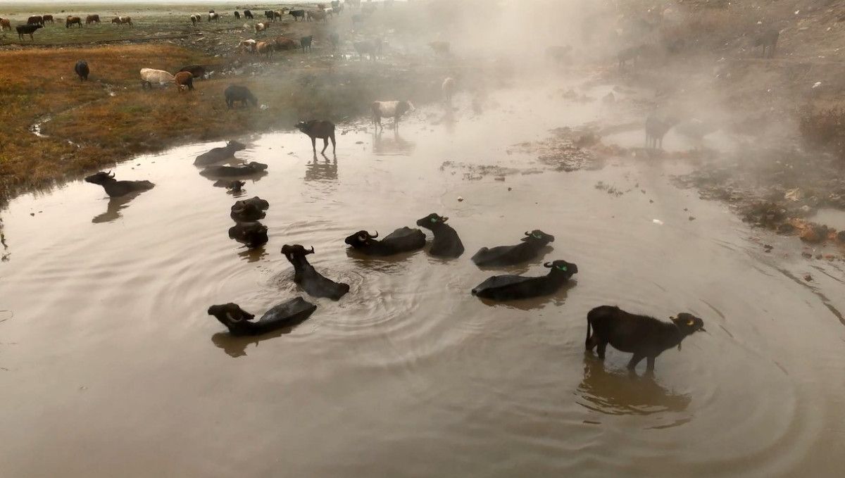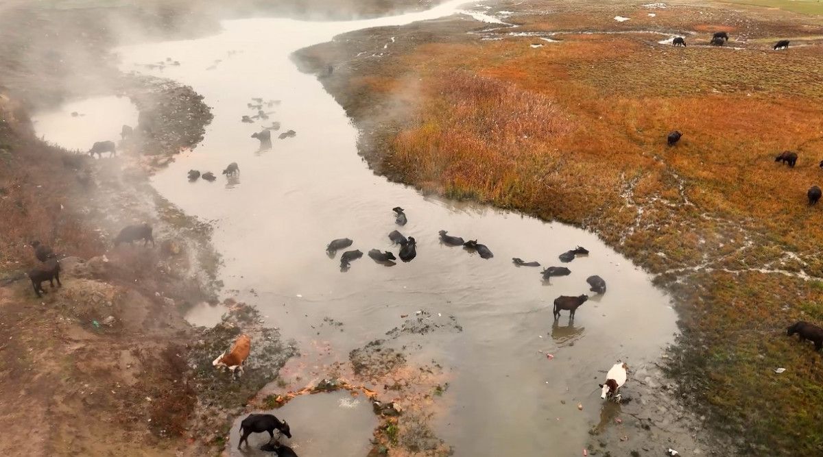 Temizlenmeleri için kaplıcaya götürülen mandaların sıcak sulardaki keyfi, akademisyen ve fotoğraf sanatçısı Veysel Akşahin tarafından drone ile görüntülendi.